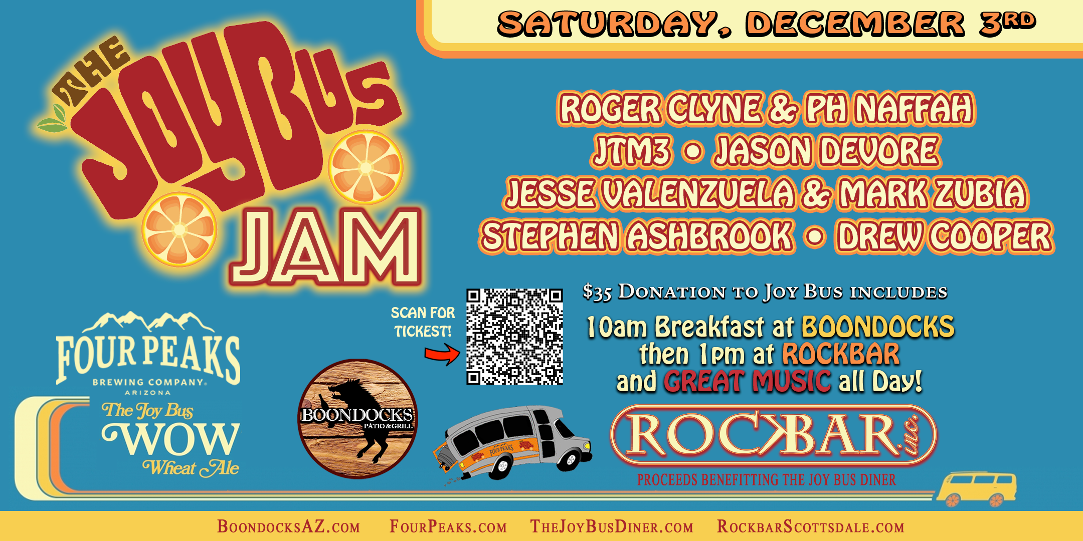 The Joy Bus Jam is brought to you by The Joy Bus Diner (Shea and SR 51), Rockbar Scottsdale, Boondocks Scottsdale and Four Peaks’ WOW Wheat.